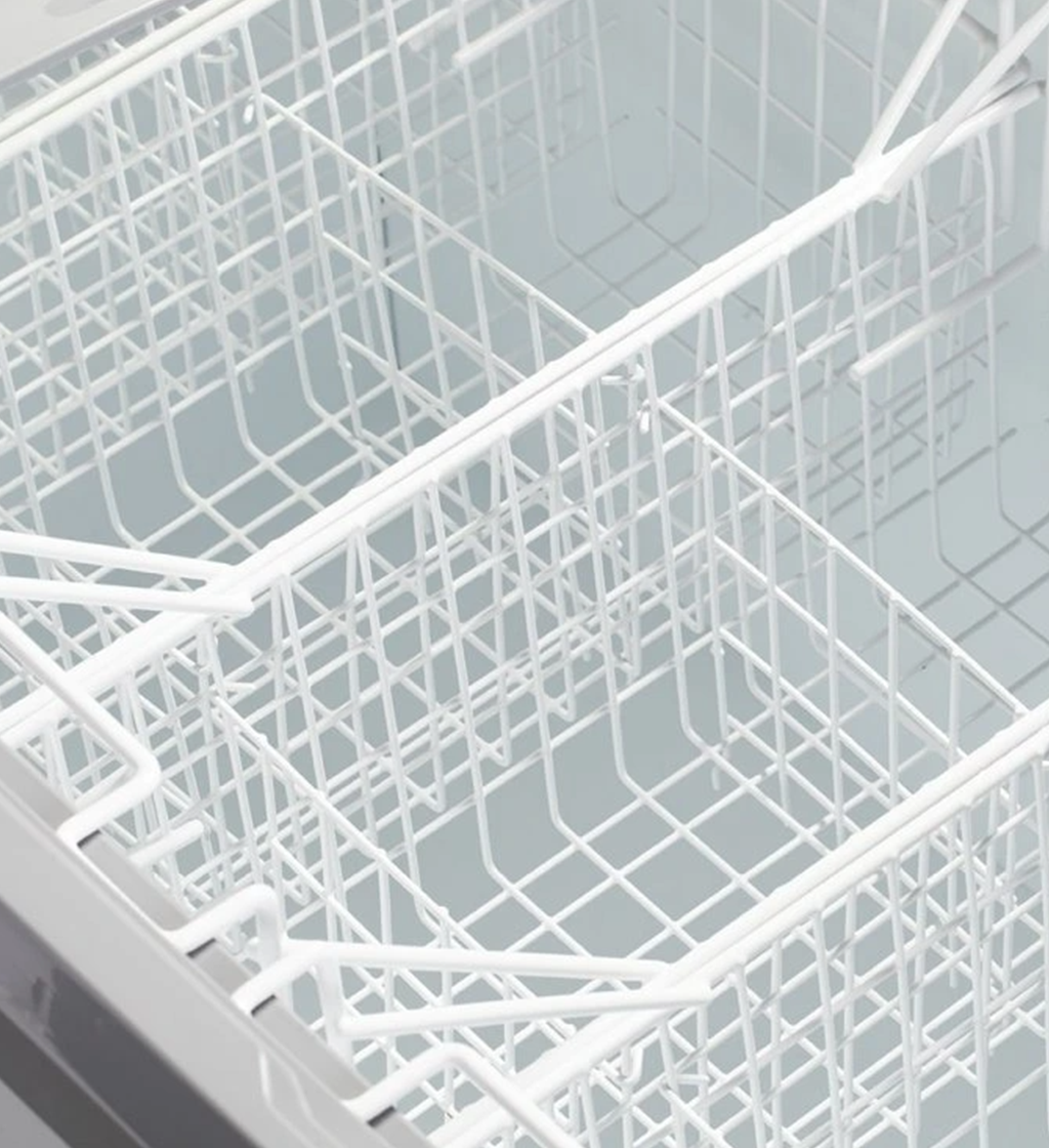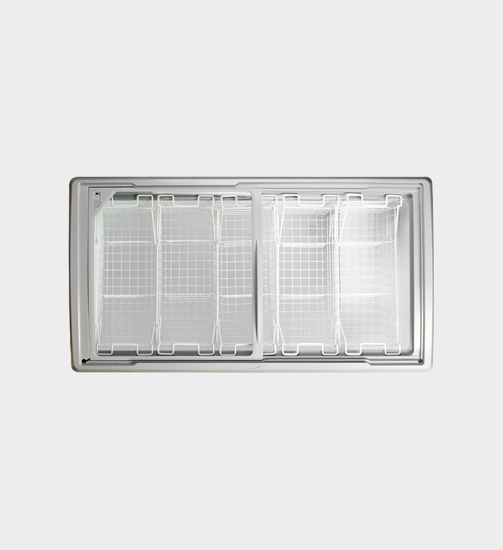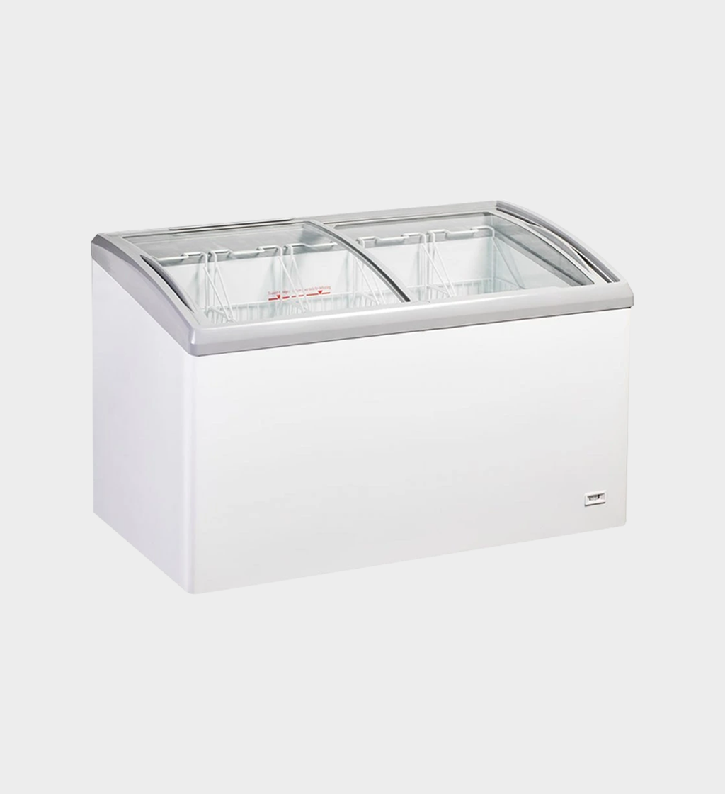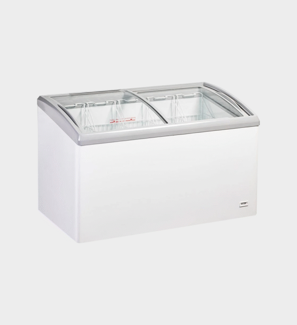 Il s’agit d’un congélateur avec des couvercles coulissants en verre incurvé et un éclairage intérieur à LED. Il a un design compact et moderne, avec 5 paniers métalliques pour organiser les produits surgelés, idéal pour les glaces ou les aliments surgelés dans les magasins.